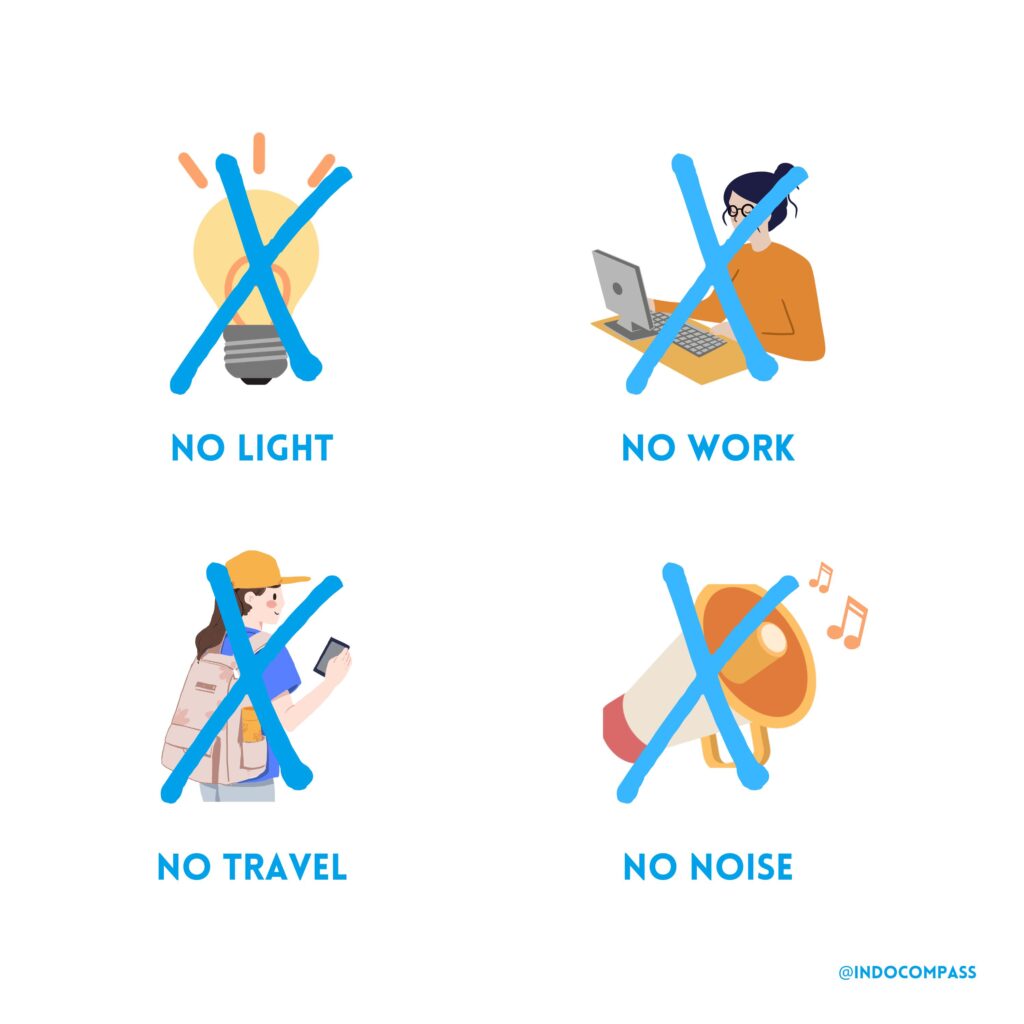 For 24 hours (from 6 AM to 6 AM the next day), the entire island comes to a complete stop. The four main prohibitions, called Catur Brata Penyepian, are :